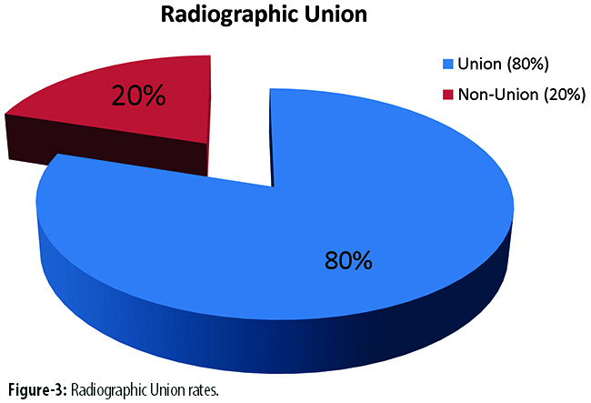 Results: Out of the 80 patients in the study, 56(70%) were male and 24(30%) were female; the male-to-female ratio being 2.3:1. Overall, 64(80%) patients showed radiographic union and 3(3.75%) patients had surgical-site infection on follow-up after 12 weeks.