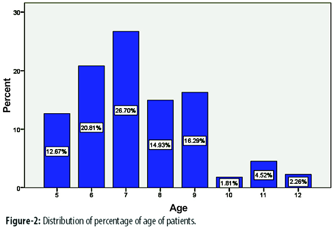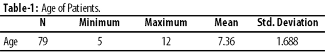 Overall mean age was 7.36±1.68 years (range: 5-12 years) (Table-1).