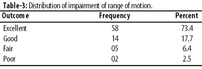 In terms of ROM outcome, Excellent results were obtained in 58(73.4%), Good in 14(17.7%), Fair in 5(6.4%) and Poor in 2(2.5%) patients (Table-3),