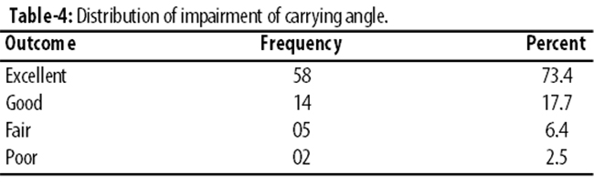 In this study Excellent results were obtained in 58 (73.4%), Good in 14 (17.7%), Fair in 5 (6.4%) and Poor in 02 (2.5%) cases. Najiullah khan et al. described Excellent results in 58-77.3%, Good results 12-16.0%, Fair 3-4% and Poor 2-2.7%4. These results are comparable to our study. Ay et al. described the results in 61 patients treated with a transverse anterior cubital approach for open reduction and pinning; the results were Excellent in 72.2% and Good in 27.8% cases.17 Nouman et al. found Excellent outcome in 21(60%) patients, Good in 9(25.71%), Fair in 4(11.43%) and Poor in 1(2.86%).8 Devkota et al. described 70.8% Excellent, 22.7% Good, 3.8% Fair and 2.5% Poor results at eight-week follow-up 18. According to Manandhar et al., 20(80%) patients were found to have Excellent and 5(20%) Good results.16 These results are also comparable. On the other hand, Reitman et al. found excellent results for only 55% of elbows.19 Aktekin et al. found that patients treated with closed reduction and pinning had better function and a greater ROM of the elbow.20 This is due to early presentation of patients, availability of improved healthcare system and provision of good facilities in their hospitals.
