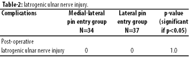 There were no cases of iatrogenic ulnar nerve injury in either group (Table-2).