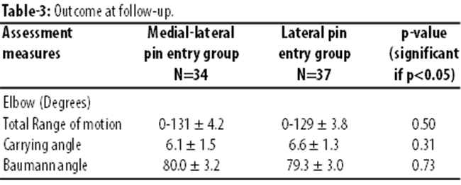 At 6-weekfollow-up, there were no significant differences between the groups regarding carrying angle, total elbow motion, Baumann angle and change in Baumannangle and loss of reduction (p>0.05 each) (Table-3).