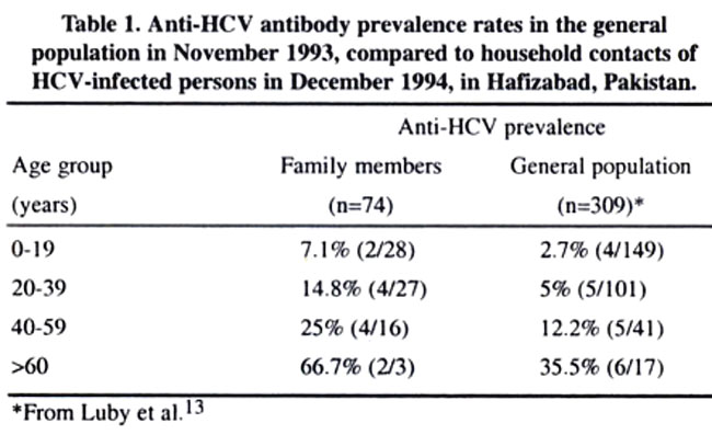 During a community-based survey in Hafizabad, a rural marketing town with a population of 125000 people in the province of Punjab in central Pakistan. an anti-HCV antibody prevalence of 6.5% was found in the general population. This rose from 2.7% in the 0-19 years age group to 35.3% in the population >59 years of age.13 We undertook the present study to measure the risk of infection in household contacts of people who were HCV-antibody-positive and to investigate the routes of transmission of HCV within the household.