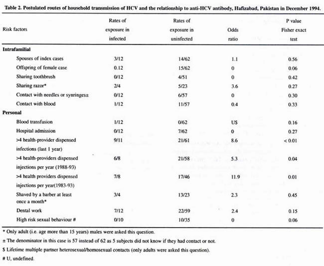 To establish a route of transmission of an infectious agent it is necessary to demonstrate that a biologically credible mode for transfer exists and that people who are exposed to it have a higher rate of infection than an appropriate unexposed comparison group. The presence of HCV in body secretions4 and sharing razors or toothbrushes, handling the needles and syringes used by the infected person and handling the blood of the infected person, make household transmission possible. That household contacts of HCV-infected persons in Hafizabad were more likely to be infected with HCV than the general population is consistent with previous observations.6,10,11 All the people we looked at in our study were household contacts of HCV infected people. When we compared the rates of exposure to secretions containing the virus in infected and uninfected household members, there was no increased risk associated with any of these exposures. Thus having an HCV-infected person in the household was a risk factor for HCV infection however these data do not suggest that household contact was a route of transmission of HCV.