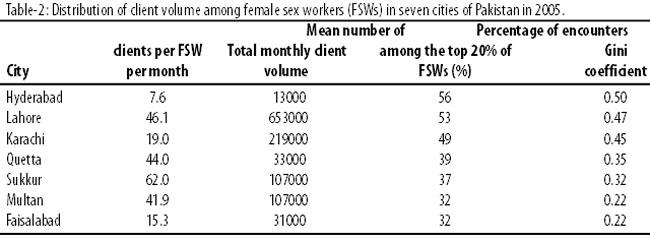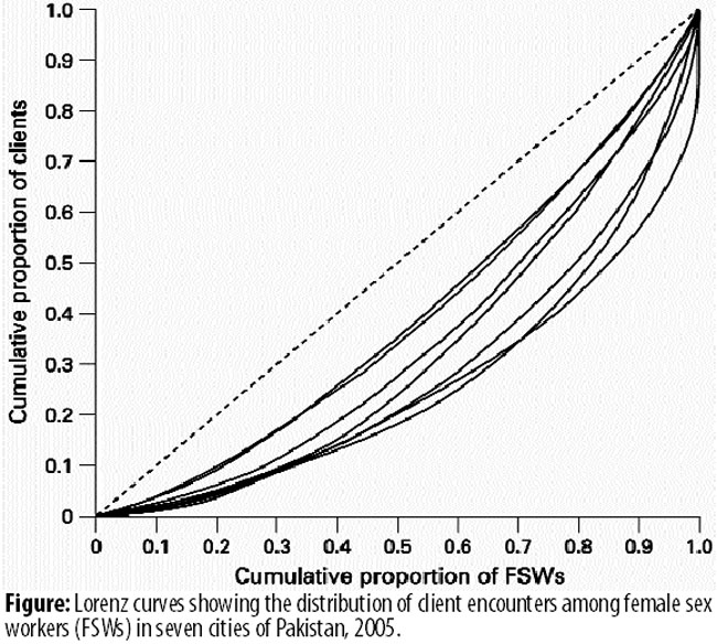 In this paper we have developed empirical measures to describe another important aspect of sex work: the client volume distribution among FSWs. Our data indicate that there are substantial differences in client-sex worker contact patterns in this regard. Whereas some cities display a relatively even distribution of clients among sex workers (eg, Faisalabad and Multan), others show a highly skewed distribution (eg, Hyderabad, Lahore and Karachi). In those cities where client volume is highly clustered, prevention programmes could potentially have a disproportionately large effect by focusing on the subset of FSWs with high client volumes. Differential patterns of client-FSW contact might also have implications for transmission dynamics. A modelling study by Ghani and Aral showed that a tendency towards client clustering could reduce the overall prevalence of both gonorrhoea and herpes simplex virus-2 among FSWs and their clients, particularly if clients tend to visit the same FSWs repeatedly.8