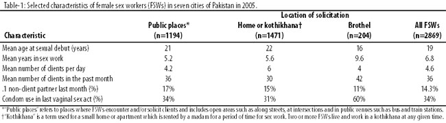 The varied distribution of sex work has implications for the design of targeted programmes for FSWs. In cities where a significant proportion of sex workers operate from public places (eg, Karachi), programmes will have to emphasise peer outreach and appropriate clinical services. In cities where most sex work is concentrated in homes and small venues such as kothikhanas (eg, Lahore and Quetta), alternative strategies will need to be employed which involve network operators and madams to facilitate outreach and service provision.