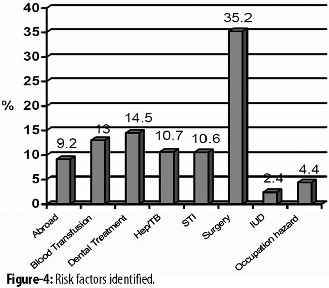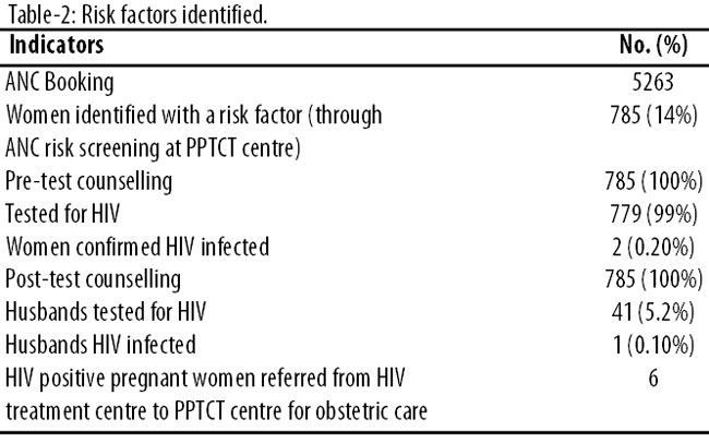 The risk factors identified are mentioned in Table-2. Post-test counselling is an excellent opportunity to make our population understand the risk and how to protect themselves and their families in future. Of two women found positive at PPTCT centre of PIMS via screening test, 1 had history of blood transfusion during a surgery 1 year back and the other woman was married to a man deported from abroad. In addition, HIV centre established separately at Medical OPD, PIMS referred 6 positive pregnant women to PPTCT centre, PIMS for treatment and care. Out of these 6 positive pregnant women, husbands of 5 were also HIV positive who had history of working abroad and sexual contacts with sex workers while the Pakistani husband of sixth positive women, who herself was from South Africa, was HIV negative.