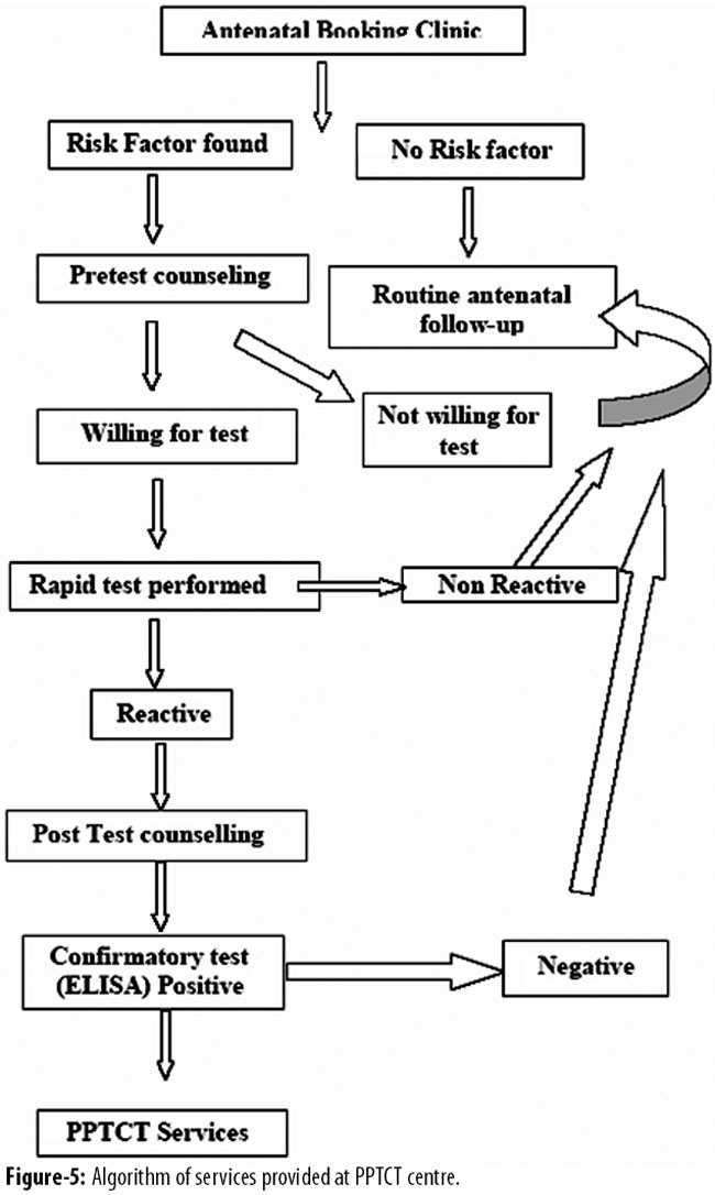 Since the onset of this epidemic, marvellous research has been carried out all over the world to find ways to minimize the risks of mother to child transmission of HIV. These interventions include combination antiretroviral drugs (ARV) during pregnancy, elective caesarean section and avoidance of breastfeeding and are collectively called \'PPTCT interventions\' (Prevention of Parent to Child Transmission of HIV). Without these PPTCT interventions, the risk of mother to child transmission of HIV is almost 30-40%10 that can be reduced to less than 2% with wide spread use of PPTCT interventions.11,12 Nevertheless, the key step to these interventions is to identify positive pregnant women first. Thus, antenatal HIV testing, though not mandatory has been gaining grounds as an essential part of antenatal care worldwide. In 2001, CDC recommended HIV to be a routine part of prenatal care for all women.13
